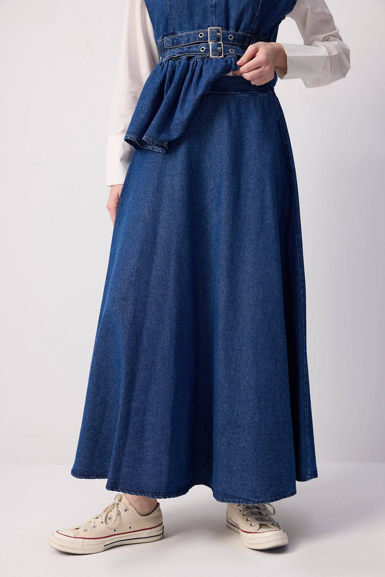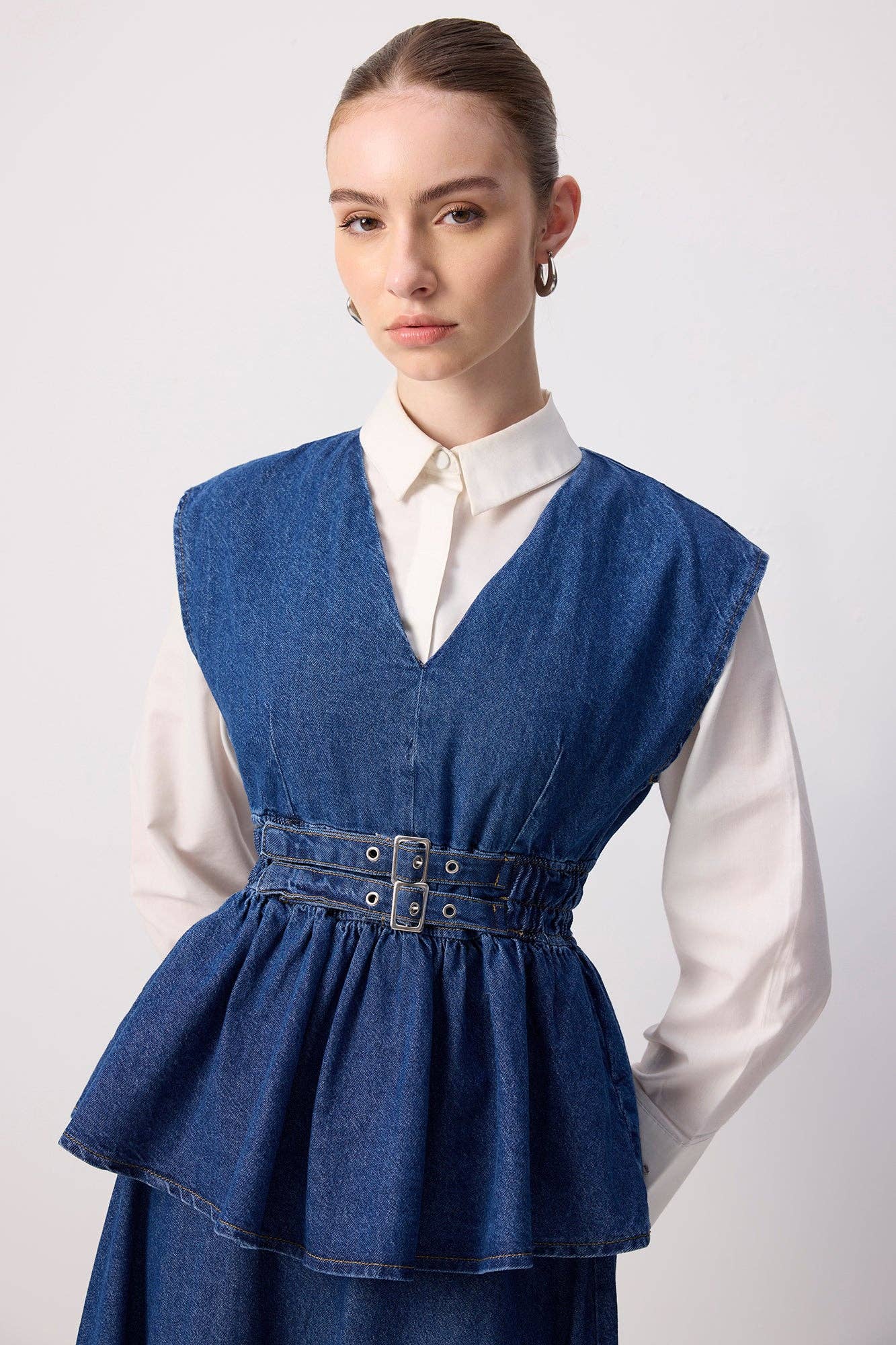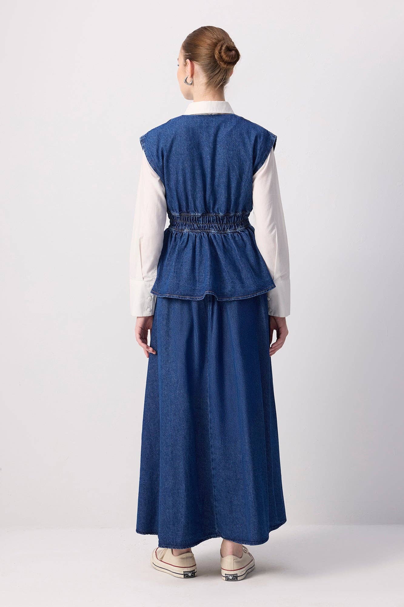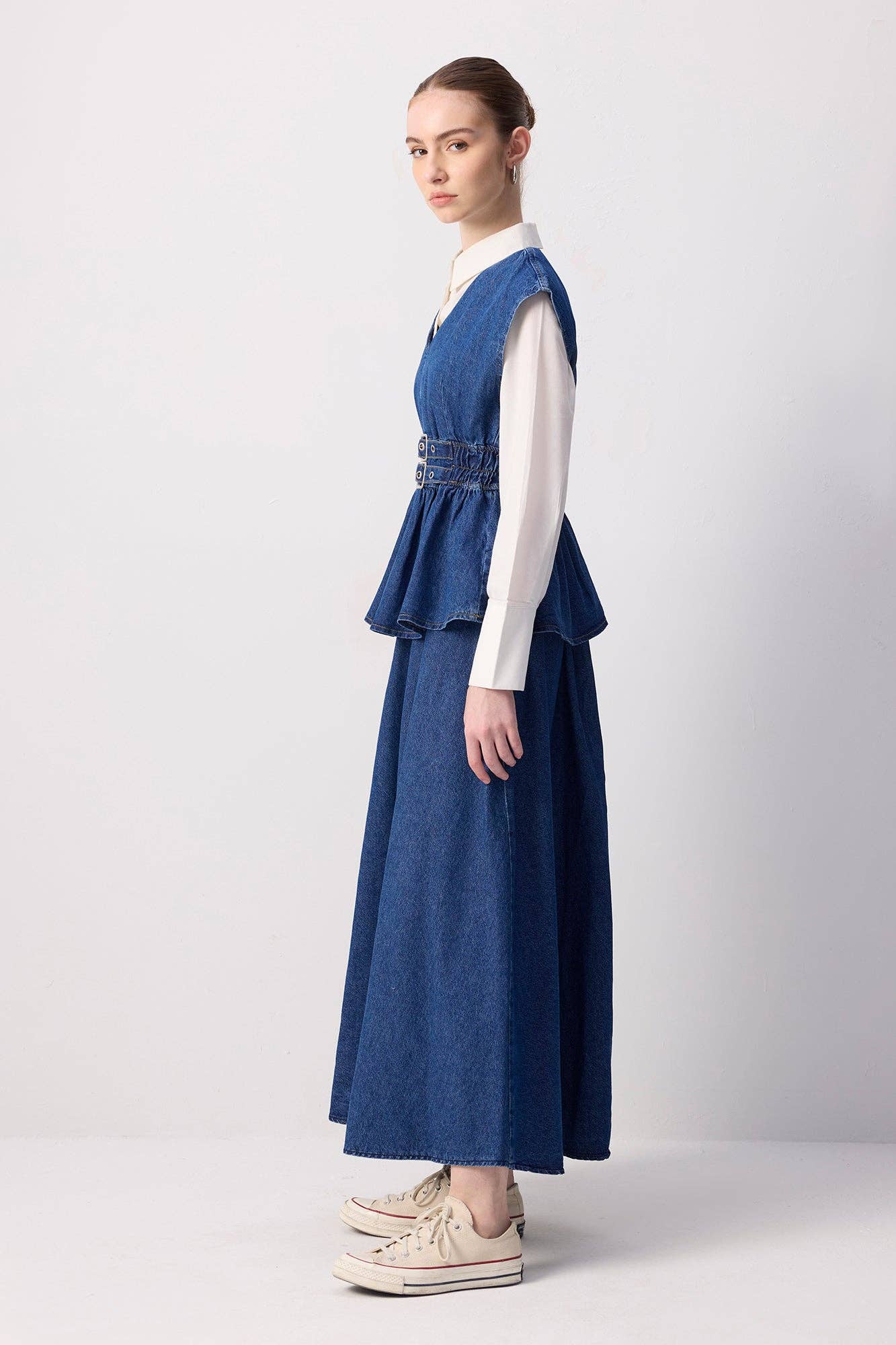 DOUBLE BELT VEST SKIRT SET: Dark Denim / M