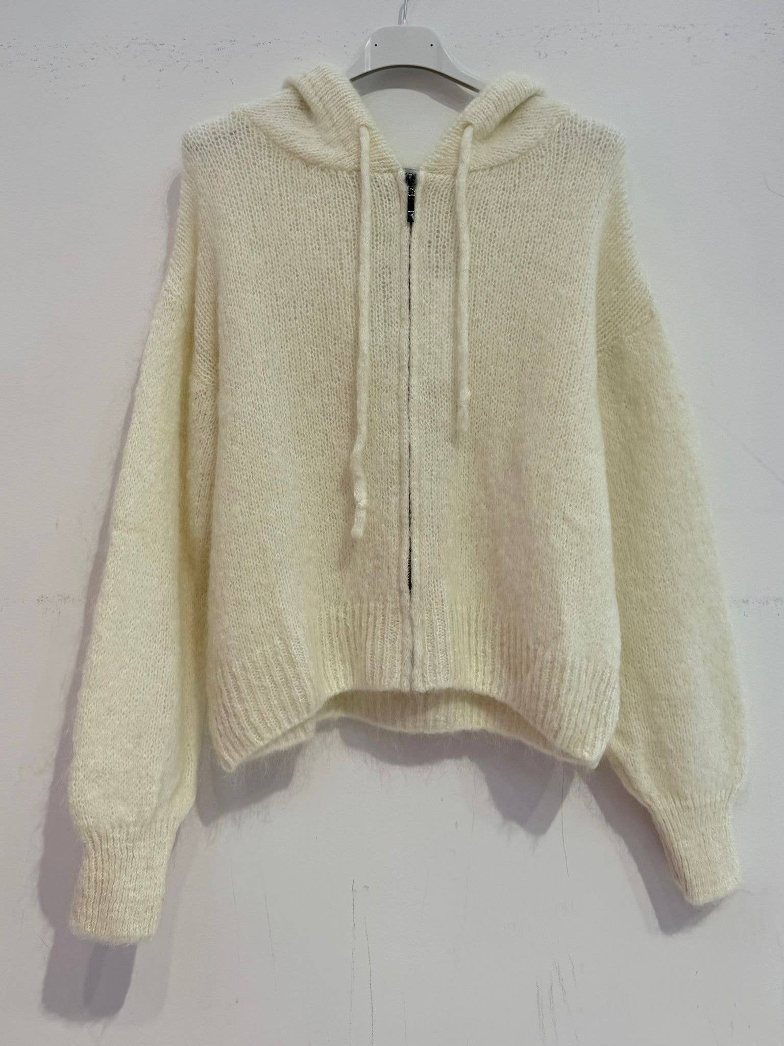 Women's soft mohair hooded cardigan, ideal for autumn, made in Italy. Perfect blend of warmth and style.